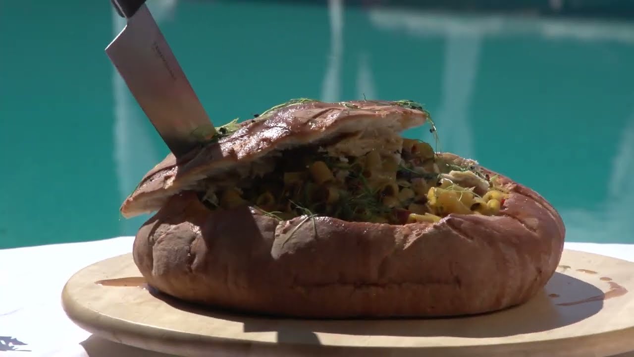 With the help of a knife, score, cut and remove the loaf, creating an opening. Season with salt and pepper and sprinkle with smoked olive oil. Pour all the above mixture into the loaf .