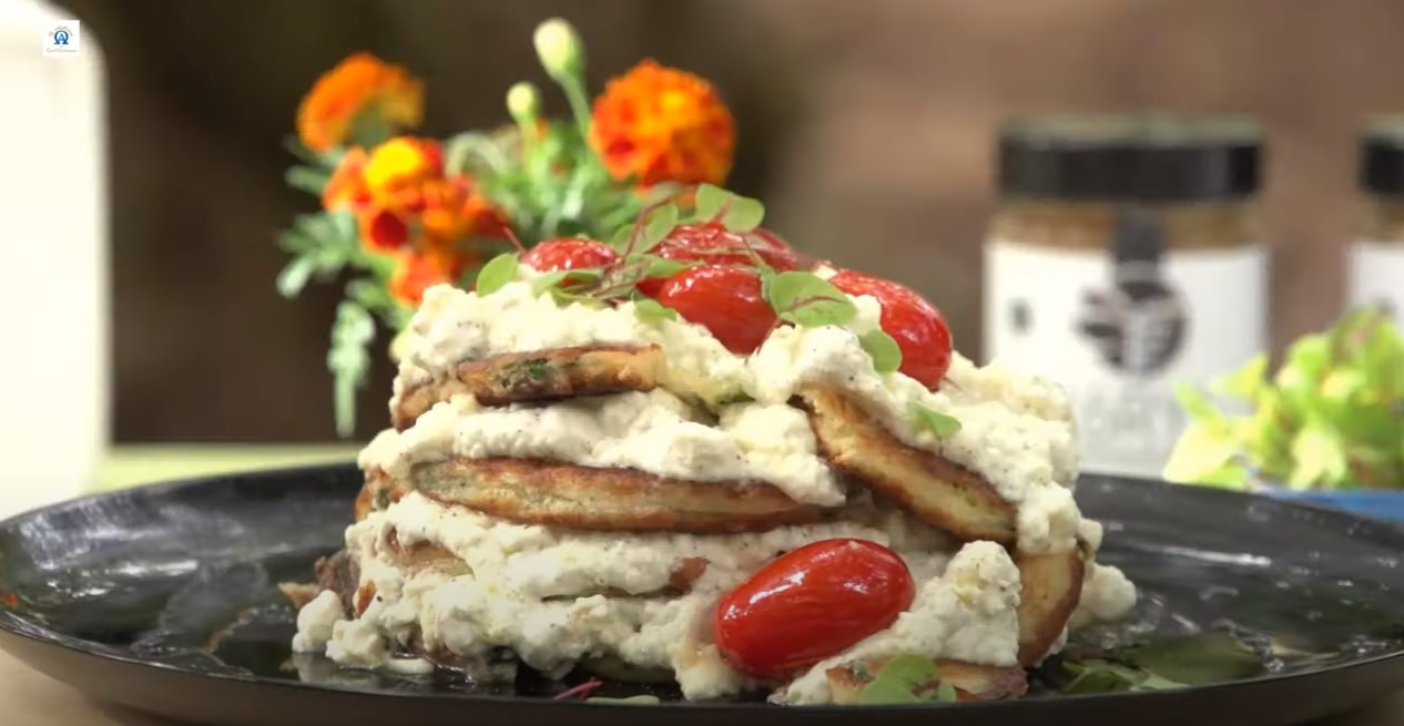 Pancake σπανάκι με κρέμα φέτας και ψημένα τοματίνια